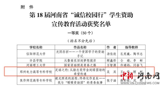 本屆活動(dòng)由河南省教育廳等五部門聯(lián)合主辦,是認(rèn)真落實(shí)黨的二十大關(guān)于“完善覆蓋全學(xué)段學(xué)生資助體系”重要決策部署、深化“資助育人”工作成效的關(guān)鍵舉措。經(jīng)過(guò)鄭州電力高等?茖W(xué)校初選和省級(jí)評(píng)比兩個(gè)階段激烈角逐,鄭州電力高等?茖W(xué)校報(bào)送的作品《足球之約:從勵(lì)志獎(jiǎng)學(xué)金到綠茵場(chǎng)的希望傳遞》(作者:吳雙,指導(dǎo)老師:王瑩、顧彬)榮獲一等獎(jiǎng),《以誠(chéng)信為舟,揚(yáng)帆感恩海--資助政策下的蛻變與成長(zhǎng)》(作者:李勝杰,指導(dǎo)老師:李澤星、王紅霞)榮獲三等獎(jiǎng)!兩份作品緊扣“守誠(chéng)信之本,懷感恩之心”主題,以獨(dú)特的視角、真摯的情感和生動(dòng)的筆觸,深刻詮釋了誠(chéng)信立身、感恩社會(huì)的精神內(nèi)涵,充分展現(xiàn)了鄭州電力高等?茖W(xué)校學(xué)生的精神風(fēng)貌和文學(xué)素養(yǎng),贏得了評(píng)審專家的高度認(rèn)可。