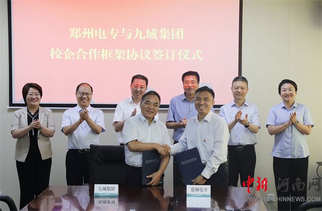 最后,鄭州電力高等?茖W(xué)校校長(zhǎng)劉全璽與河南九域龍?jiān)措娏Πl(fā)展集團(tuán)有限公司總經(jīng)理王喜軍簽署了校企合作框架協(xié)議。