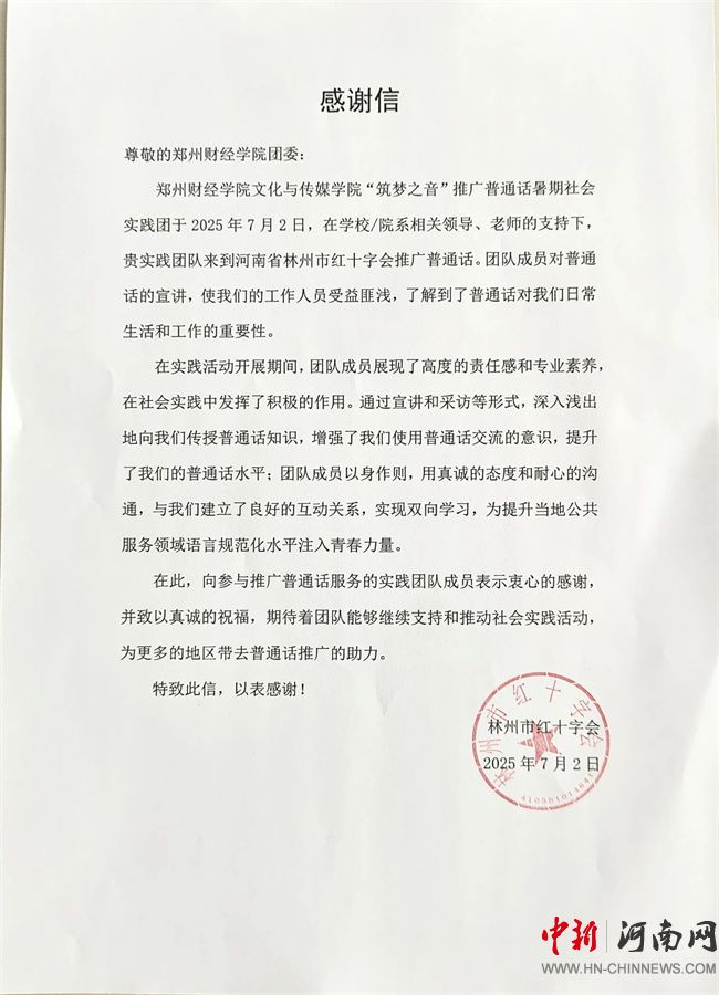 林州市紅十字會(huì)發(fā)來的感謝信