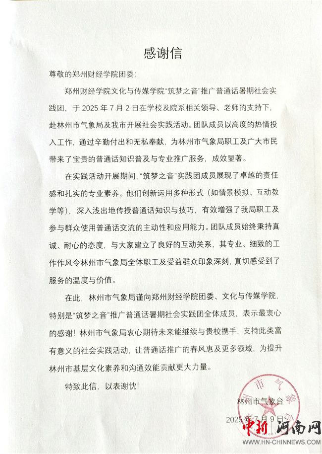 林州市氣象臺(tái)發(fā)來的感謝信