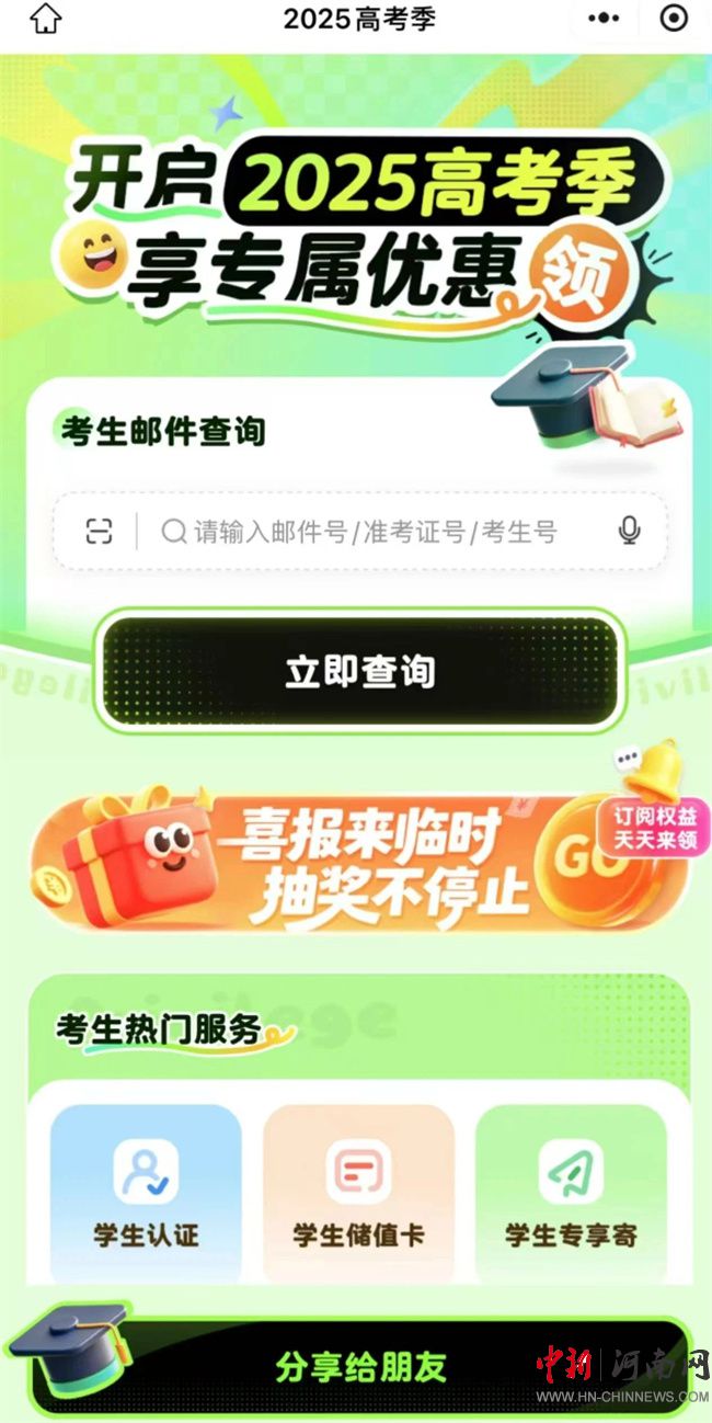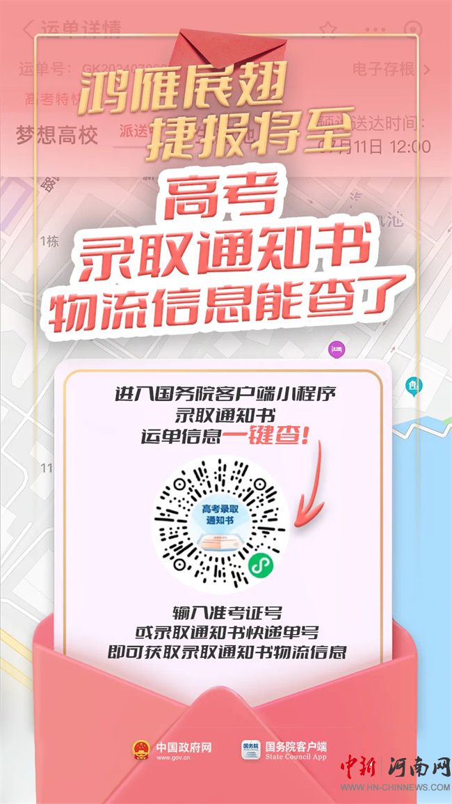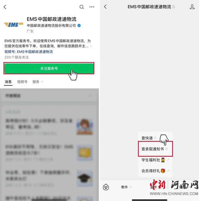 關(guān)注“EMS中國(guó)郵政速遞物流”微信公眾號(hào),進(jìn)入公眾號(hào)消息頁(yè)面,點(diǎn)擊菜單欄的“查件”,選擇“查錄取通知書”,輸入“準(zhǔn)考證號(hào)”或“考生號(hào)”即可查詢。