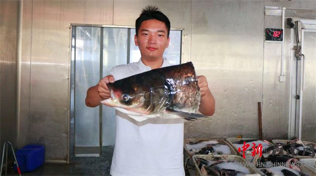 團(tuán)隊(duì)創(chuàng)始人楊意中在信陽國兵魚業(yè)公司生產(chǎn)車間展示應(yīng)用新技術(shù)后鎖鮮效果優(yōu)異的魚頭