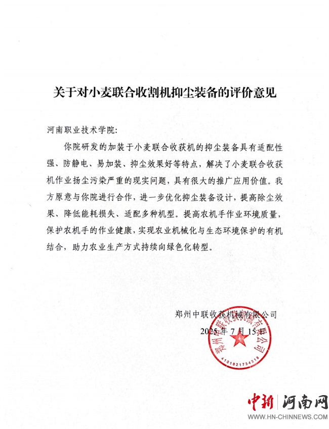 圖11 鄭州中聯(lián)收獲機械有限公司《關(guān)于對小麥聯(lián)合收割機抑塵裝備的評價意見》