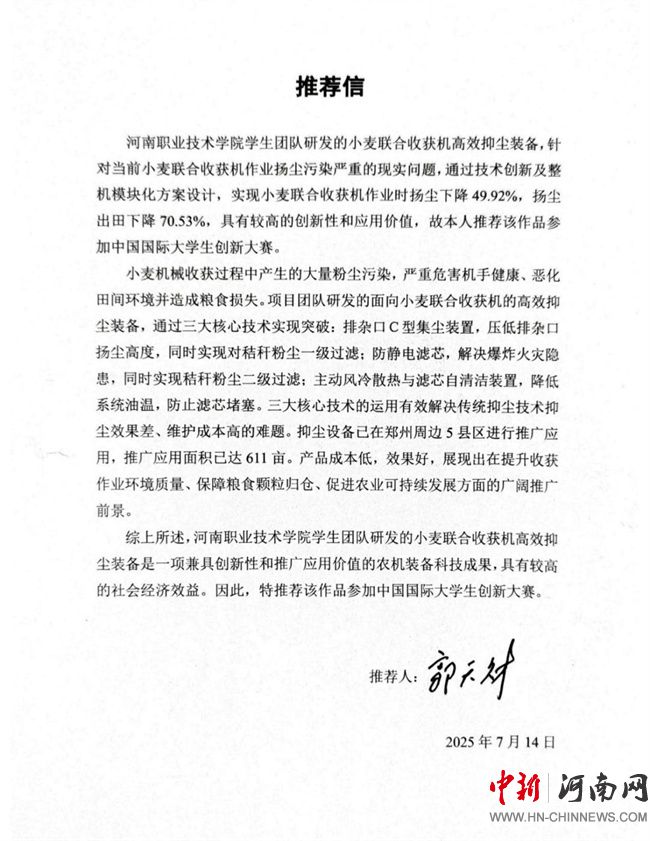 團隊與鄭州樸華科技有限公司、鄭州中聯(lián)收獲機械有限公司協(xié)作推進技術(shù)轉(zhuǎn)化,通過輕量化設(shè)計、模塊化改造,使設(shè)備適配多種機型。在登封、新鄭等5縣區(qū)的611畝麥田推廣中,農(nóng)機手反饋“視野清晰了,呼吸順暢了”,鄭州中聯(lián)收獲機械有限公司評價對本設(shè)備做出評價意見:“該設(shè)備具有防靜電、自清潔、易裝配等優(yōu)點,具有重大推廣價值”。