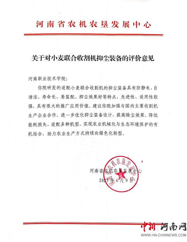 河南省農(nóng)機農(nóng)墾發(fā)展中心出具相關(guān)評價:
