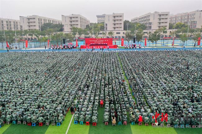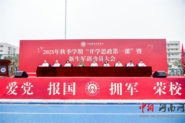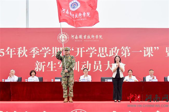 中新河南網(wǎng)9月16日電(胡艷) 秋色為序,征程新啟。9月15日早上,河南職業(yè)技術(shù)學院2025年秋季學期“開學思政第一課”暨新生軍訓動員大會在田徑運動場隆重舉行。校領(lǐng)導厲勵、夏新顏、肖瓏、李玉峰、盛興文、任楓軒、朱永寬及承訓單位總教官張利南出席大會。學校各相關(guān)職能部門負責人,各二級學院黨總支書記、副書記,團總支書記、新生輔導員,馬克思主義學院相關(guān)負責人、教師代表,2025級全體新生和全體承訓教官共7600余人參加大會。校黨委副書記、工會主席田華主持大會。