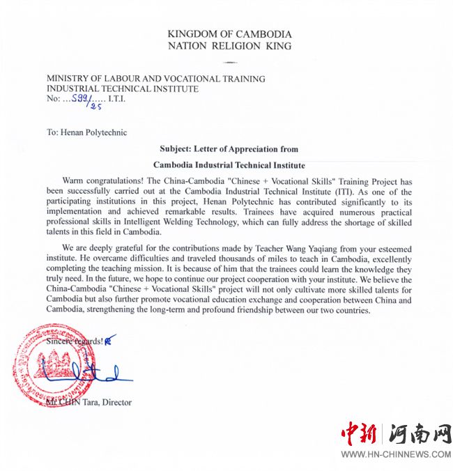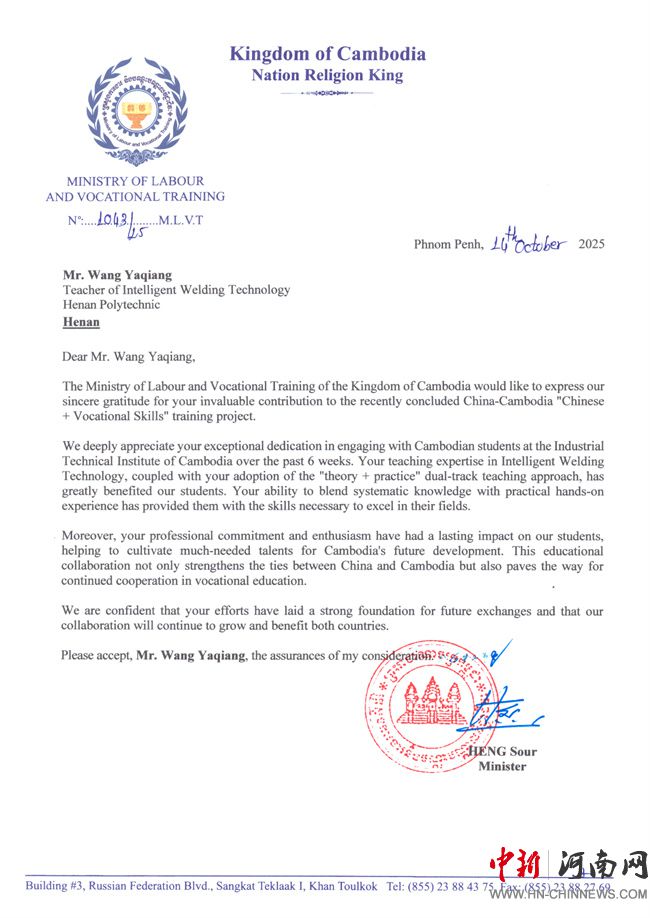 中新河南網(wǎng)10月29日電(王亞強、韓瑞) 近日,河南職業(yè)技術學院收到來自柬埔寨勞工與職業(yè)培訓部和工業(yè)技術學院發(fā)來的兩封感謝信。信中寫道:感謝你們?yōu)橹袊?mdash;柬埔寨“中文+職業(yè)技能”項目所做的貢獻,王亞強老師傾心指導柬埔寨學員的敬業(yè)精神令人感佩,您憑借智能焊接技術領域的專業(yè)造詣,采用“理論+實踐”雙軌并行的教學模式,使學員們受益匪淺……