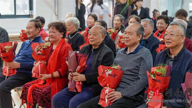 活動現(xiàn)場,學生代表手捧康乃馨、長壽花等寓意美好的鮮花,逐一獻給在場的老人,表達對長輩們的崇高敬意和美好祝愿。