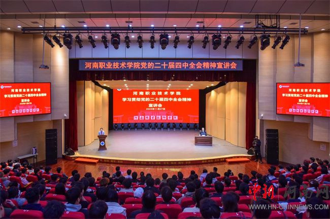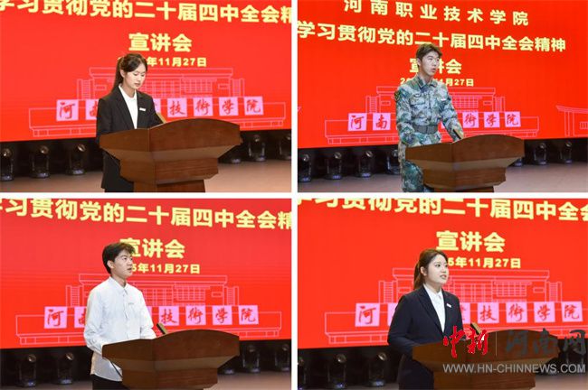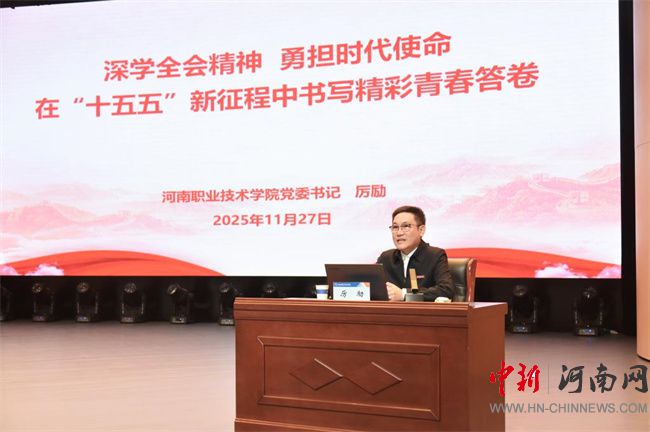 中新河南網(wǎng)11月30日電(谷世飛) 11月27日下午,河南職業(yè)技術(shù)學(xué)院黨委書記厲勵(lì)以《深學(xué)全會(huì)精神、勇?lián)鷷r(shí)代使命——在“十五五”新征程中書寫精彩青春答卷》為題,為學(xué)校青年學(xué)生宣講黨的二十屆四中全會(huì)精神。第七期校青馬班學(xué)員、第一期團(tuán)校學(xué)員、校院兩級(jí)學(xué)生會(huì)主要學(xué)生干部代表、國旗護(hù)衛(wèi)隊(duì)全體成員、電子與物聯(lián)網(wǎng)學(xué)院電子信息工程技術(shù)253班全體同學(xué),以及黨委宣傳部、校團(tuán)委等部門負(fù)責(zé)同志共500余人現(xiàn)場(chǎng)聆聽。校黨委副書記、工會(huì)主席田華主持宣講會(huì)。