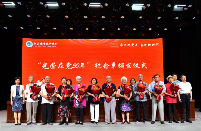 在第一個(gè)階段中,李桂貞和梅樂(lè)堂分別為受邀的10位黨齡滿50年黨員代表頒發(fā)“光榮在黨50年”紀(jì)念章,見(jiàn)證31位黨齡滿50年黨員為學(xué)校的發(fā)展付出青春和才華,是我們這一代“河職人”學(xué)習(xí)的榜樣。學(xué)校領(lǐng)導(dǎo)班子成員分別為省級(jí)和校級(jí)黨建工作樣板支部頒發(fā)牌匾,充分顯示全國(guó)首批、省級(jí)示范和校級(jí)黨建工作樣板支部,在學(xué);鶎狱h建工作中的示范引領(lǐng)作用。隨后,李桂貞領(lǐng)誓,全體黨員重溫入黨誓詞,體現(xiàn)了全體黨員對(duì)黨的赤膽忠心,激勵(lì)黨員不忘初心,時(shí)刻永葆黨員的先進(jìn)性本色。