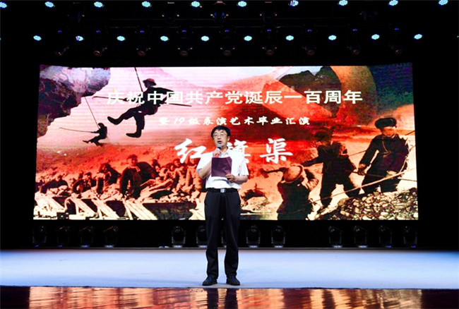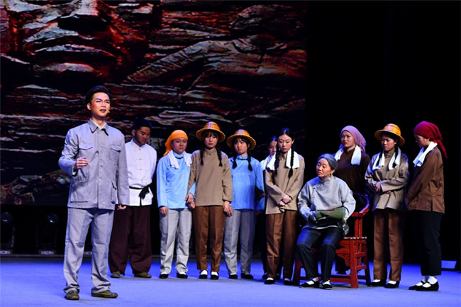 在第二個(gè)階段中,展演了音樂(lè)學(xué)院師生排演的現(xiàn)代紅色話劇《紅旗渠》。40余名2019級(jí)表演藝術(shù)專業(yè)學(xué)生分別扮演了林縣縣委書(shū)記楊貴等劇中人物,通過(guò)舞臺(tái)場(chǎng)景、燈光效果和學(xué)生的表演技藝和才能,真實(shí)再現(xiàn)了林縣縣委書(shū)記楊貴帶領(lǐng)林縣人民,歷時(shí)10年在太行山懸崖峭壁上修建紅旗渠的艱辛歷程事跡;生動(dòng)詮釋了“自力更生、艱苦創(chuàng)業(yè)、團(tuán)結(jié)協(xié)作、無(wú)私奉獻(xiàn)”的紅旗渠精神,讓觀看的師生現(xiàn)場(chǎng)接受了一次鮮活的紅色教育。