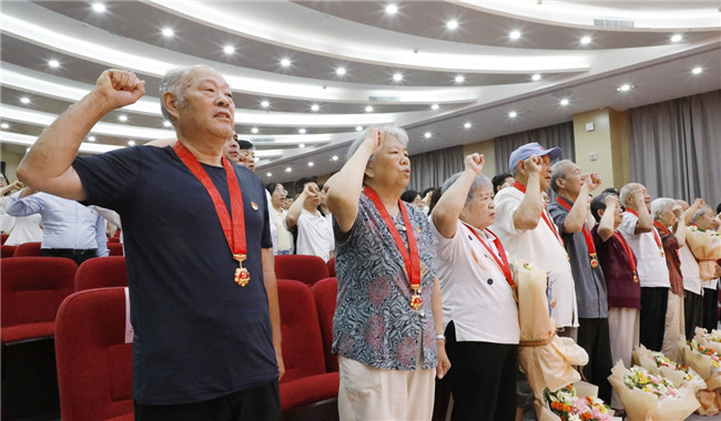 大會開始前,學(xué)校領(lǐng)導(dǎo)還為滿50年黨齡的老黨員同志佩戴了“光榮在黨50年”紀(jì)念章,并向他們致以美好祝福,感謝他們?yōu)榻逃聵I(yè)、立德樹人所做出的貢獻(xiàn)。