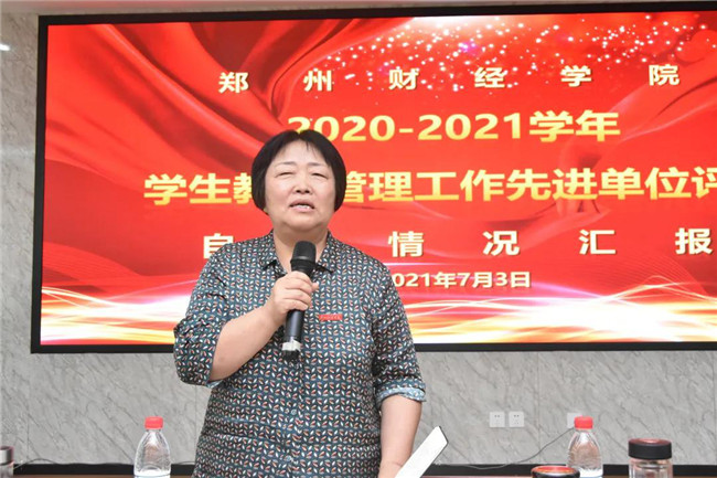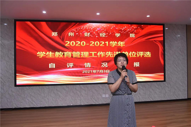 陳志強(qiáng)宣布2020-2021學(xué)年學(xué)生教育管理工作先進(jìn)單位評(píng)選自評(píng)情況匯報(bào)會(huì)正式開(kāi)始。各二級(jí)學(xué)院匯報(bào)人按抽簽順序依次上臺(tái),按照量化考核標(biāo)準(zhǔn)要求,從學(xué)生工作管理方法,思想政治教育,日常行為管理和特色文化活動(dòng)等多個(gè)方面匯報(bào)了本學(xué)院一學(xué)年來(lái)的學(xué)生管理工作成果。