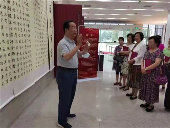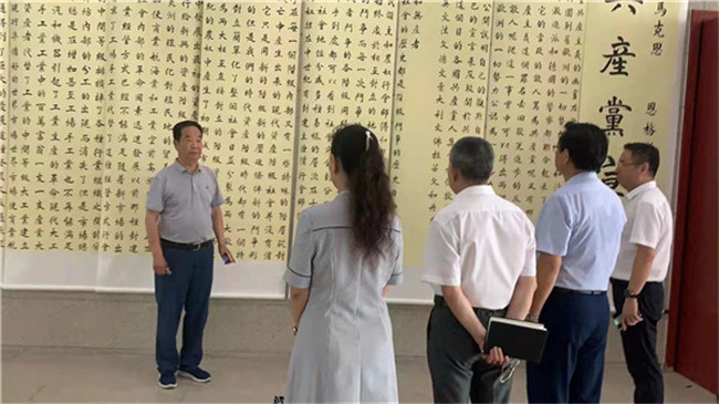 自6月29日作品展出以來(lái),王安邦教授不顧年事已高、不畏酷暑,堅(jiān)持每天早上8點(diǎn)準(zhǔn)時(shí)來(lái)到展廳,激情澎湃地為大家講述了《共產(chǎn)黨宣言》產(chǎn)生的歷史背景、歷史價(jià)值和現(xiàn)實(shí)意義,特別講述了《共產(chǎn)黨宣言》對(duì)中國(guó)共產(chǎn)黨以及中國(guó)社會(huì)建設(shè)與發(fā)展的深刻影響,深刻闡述了宣言在當(dāng)今社會(huì)彰顯著的巨大真理力量和時(shí)代價(jià)值,為觀展人員上了一堂生動(dòng)的、特殊的黨史學(xué)習(xí)教育課。大家受益匪淺,紛紛留言表示祝賀和敬意。在不到半個(gè)月的時(shí)間里,王安邦教授已累計(jì)為該校師生黨支部開(kāi)展主題黨日活動(dòng),社會(huì)各界參觀者等,專題講解20場(chǎng),學(xué)習(xí)參觀者累計(jì)千余人次。每一個(gè)參觀團(tuán)隊(duì)在參觀過(guò)程中,時(shí)而停留下來(lái)欣賞書(shū)法作品,時(shí)而深入交流學(xué)習(xí)心得感悟,贊嘆不斷、感動(dòng)不已。河南省僑聯(lián)、銀基社區(qū)、康復(fù)社區(qū)、明理路社區(qū)的黨員同志紛紛來(lái)到這里,在學(xué)習(xí)和參觀中重溫經(jīng)典著作、汲取精神營(yíng)養(yǎng)、堅(jiān)定初心使命。中醫(yī)藥文化學(xué)者許敬生教授及校外參觀者更是分別提筆,即興賦詩(shī):“不忘初心耄耋年,正楷百篇書(shū)宣言。銘記黨史艱辛路,大業(yè)永興萬(wàn)代傳。”“心中有馬恩,筆下見(jiàn)精神。字里透使命,行間顯初心。”表達(dá)自己的敬佩與感動(dòng)之情。