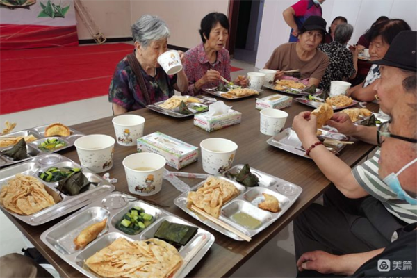 演出結(jié)束后,社區(qū)工作人員端出精心準(zhǔn)備的麻葉、粽子、菜角等讓老人在一起聚餐。
