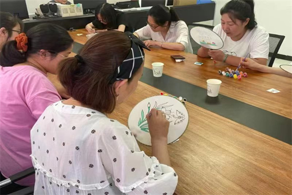 隨后職工們拿起畫筆蘸上各色顏料,在老師的指導(dǎo)下,將自己心中的荷花、梅花一一描畫到扇面上。一個(gè)多小時(shí)后,一幅幅精美的扇子繪制完成了,開心的拿起自己的作品互相展示交流,輕搖折扇微風(fēng)徐來,為炎炎夏日帶來絲絲清涼,也將團(tuán)扇文化根植在職工們的心中。