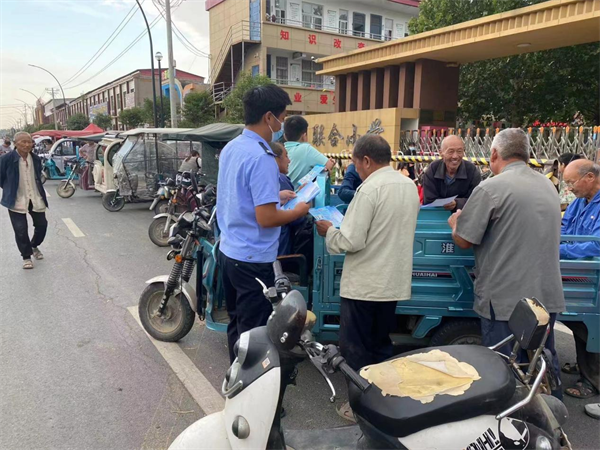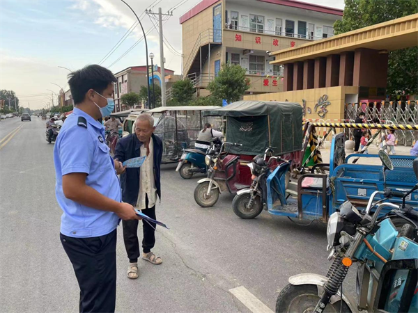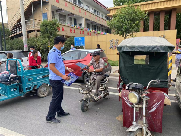 中新河南網(wǎng)9月22日電: 開封市城鄉(xiāng)一體化杏花營農(nóng)場綜治辦組織工作人員、網(wǎng)格員在學(xué)生放學(xué)期間利用護學(xué)崗工作開展普法宣傳活動。