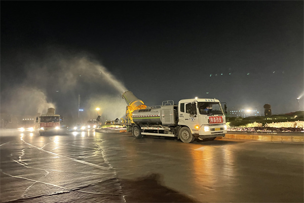 晚9點(diǎn),工作人員和消殺車輛已全部準(zhǔn)備就緒,隨著裝有消毒水的大型霧炮車、步道車、消毒灑水車緩緩駛向街道,消殺工作全面啟動(dòng)。