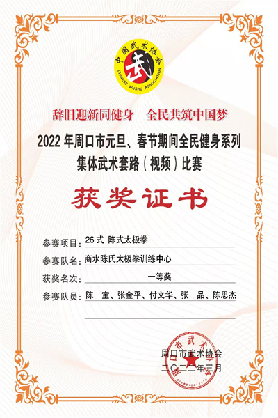中新河南網(wǎng)4月10日電:辭舊迎新同健身,全民共建中國(guó)夢(mèng)。2022年3月,在周口市元旦、春節(jié)期間全民健身系列(視頻)集體武術(shù)套路比賽中,商水縣陳氏太極拳訓(xùn)練中心隊(duì)員參賽的26式陳式太極拳榮獲集體一等獎(jiǎng)!