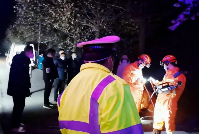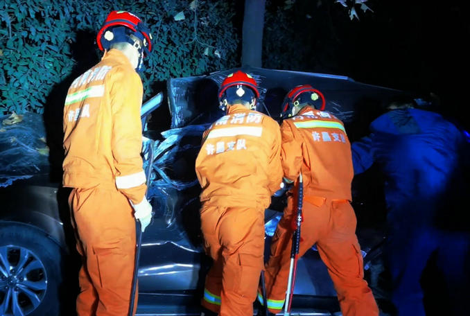 河南禹州:凌晨一輛汽車撞上道路石墩 消防隊(duì)員連夜趕赴破拆救援