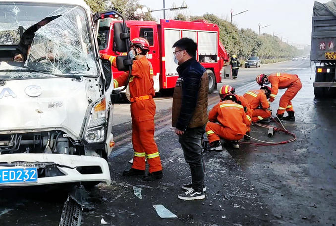 河南禹州:兩輛貨車發(fā)生追尾一人被困 消防隊(duì)員迅速趕赴破拆救援