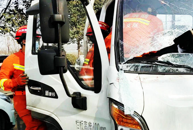 到達(dá)現(xiàn)場(chǎng)后,消防救援人員發(fā)現(xiàn):一輛廂貨車追尾大貨車后斜停在路中間,車頭輕微變形,駕駛室車門無(wú)法打開,駕駛員一條腿卡在方向盤軸之間,意識(shí)清醒,暫無(wú)生命危險(xiǎn)。