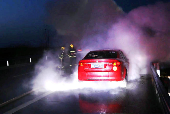 到達(dá)現(xiàn)場后,消防救援人員發(fā)現(xiàn):一輛紅色的小轎車發(fā)生自燃,發(fā)動機(jī)艙有滾滾濃煙正在冒出,隨時有爆燃的危險。