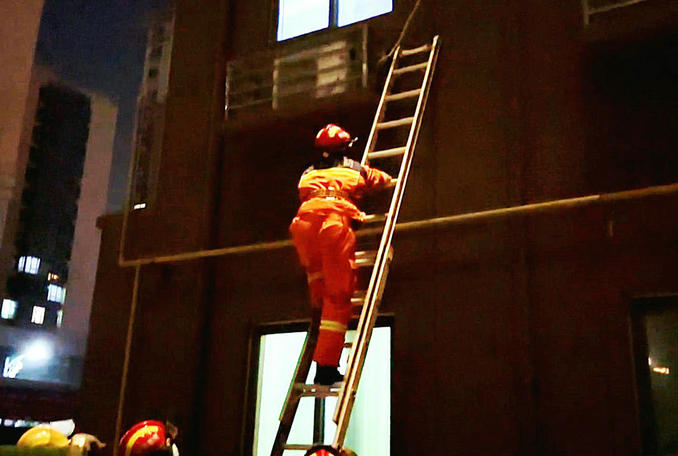 在做好安全保護的前提下,一名救援人員爬梯成功進入臥室打開房門。