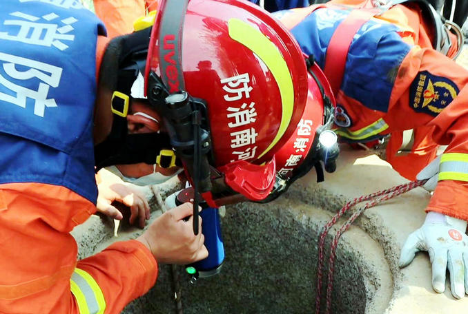 考慮到狹窄的深井內(nèi)缺氧,現(xiàn)場的消防救援人員首先用空氣呼吸器氣瓶向井內(nèi)供氧。隨后,由一名體型較小的消防員攜帶繩索及腰帶采取“倒掛金鉤”的方式垂直下降深井內(nèi)營救。