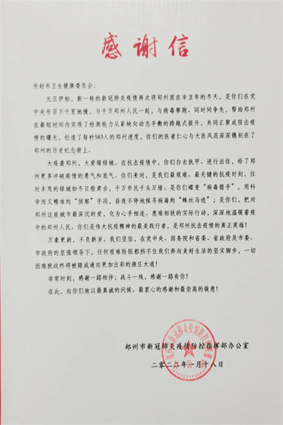 元旦伊始,新一輪的新冠肺炎疫情再次將鄭州困在辛丑年的冬天,是你們?cè)邳h中央號(hào)召下千里馳援,與千萬鄭州人民一起,與病毒賽跑、同時(shí)問爭(zhēng)先,幫助鄭州在最短時(shí)間內(nèi)實(shí)現(xiàn)了檢測(cè)能力從緊缺向動(dòng)態(tài)平衡的跨越式提升,共同匯聚成阻擊疫情的曙光,創(chuàng)造了每秒583人的鄭州速度,你們的醫(yī)者仁心與大醫(yī)風(fēng)范深深鐫刻在了鄭州的歷史紀(jì)念冊(cè)上。