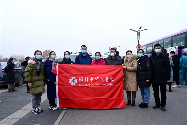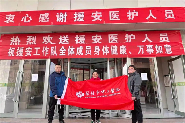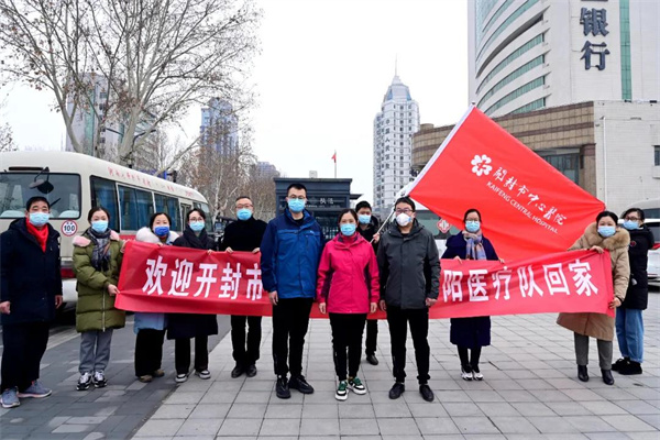 開封市中心醫(yī)院副院長錢偉軍帶領醫(yī)務部主任楊文、醫(yī)學檢驗科副主任李相磊、李航及相關人員到金明廣場迎接隊員們回家。