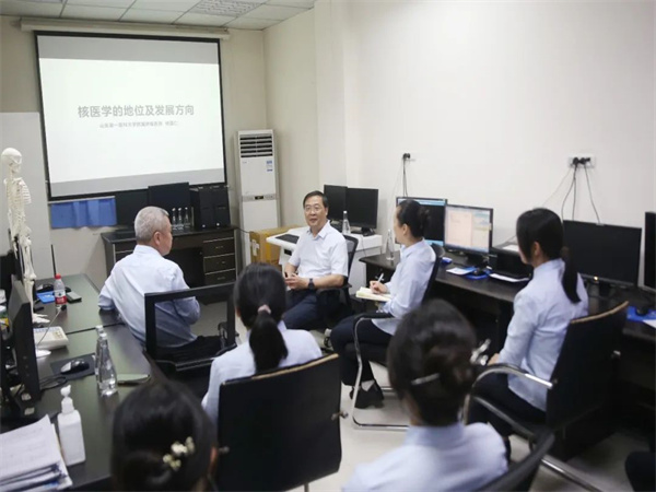 隨后楊國仁教授來到核醫(yī)學(xué)科,就核醫(yī)學(xué)科發(fā)展規(guī)劃、醫(yī)療管理、專業(yè)技術(shù)、科研教學(xué)等方面進(jìn)行詳細(xì)地交流與分享。對于年輕醫(yī)生提出的疑難問題,他從病理生理、臨床表現(xiàn)、影像學(xué)特點(diǎn)、新的分子探針應(yīng)用、科研思路等多維度、多角度、多方位進(jìn)行詳盡的分析闡述,讓大家領(lǐng)略到分析、思考、解決疑難問題和科研創(chuàng)新的思路歷程。