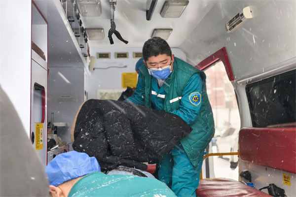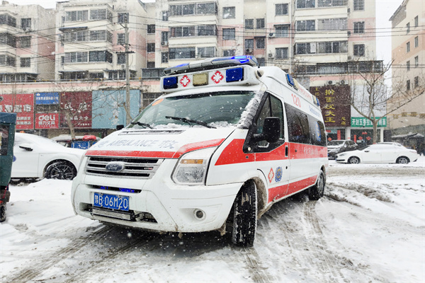 雪越下越大,救護(hù)車在泥濘道路上穩(wěn)健地行駛,馬路上翻滾著泥濘的冰雪,車窗上漂浮著雪花。救護(hù)車司機(jī)師傅張東亮的眼神中充滿了緊張和堅(jiān)定,他的心中只有一個信念:盡快將病人安全送達(dá)醫(yī)院。他邊打著方向盤,邊打開車上的除霧裝置,提高車廂溫度,窗外的雨刷器左右搖擺,“吱吱”作響,結(jié)成冰的雪花逐漸融化,氤氳在泛著霧氣的車窗上。