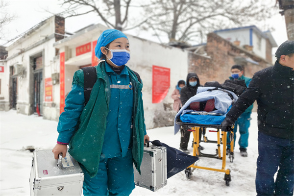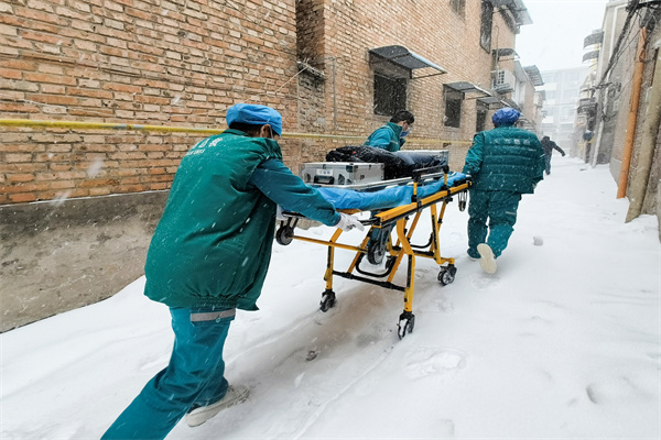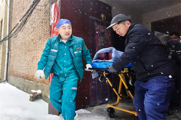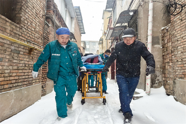 “一!二!三!咱們四個人一人抬一個角,小心腳下,往前走!”在高醫(yī)生的指揮下,眾人將患者抬上擔(dān)架,小心翼翼地穿過下坡臺階,步入厚重積雪覆蓋的胡同巷子中。