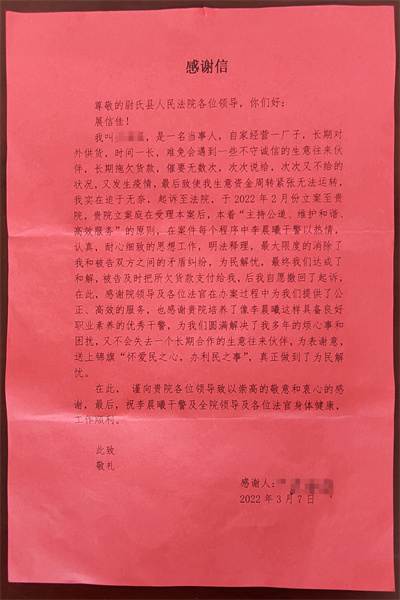 中新河南網(wǎng)3月8日電:陽春三月,春意盎然,在3.8婦女節(jié)當(dāng)天,尉氏縣人民法院收到了一份特別的禮物:當(dāng)事人的一面上書“懷愛民之心,辦利民之事”十個(gè)金燦燦大字的錦旗和一封飽含對(duì)尉氏法院認(rèn)可的感謝信。