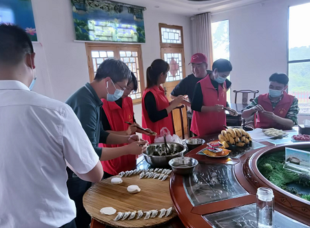 村支兩委干部和平橋區(qū)政法委工作人員共同精心準(zhǔn)備著,擇菜、和面、剁餡搟皮,現(xiàn)場忙得熱火朝天,大家分工明確,熱情滿滿,邊干活邊拉家常,快樂洋溢在每個人臉上。