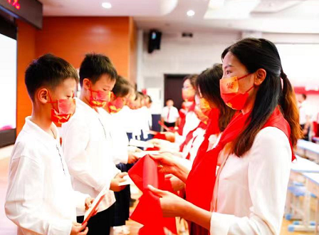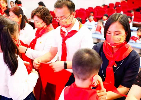 在歡快的歌聲中,黨員、團隊教師代表鄭重地為新隊員系上了鮮艷的紅領巾,新隊員們目光堅毅,洋溢著自豪的笑容。這是星星火炬交接的時刻,更代表著紅色基因代代相傳!從此,鮮艷的紅領巾飄蕩在胸前,無上的光榮涌動在新隊員們的心中。