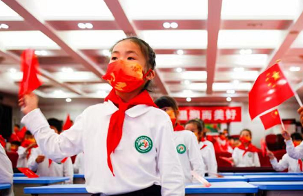 面向隊旗,一年級的新隊員們右手握拳、莊重宣誓:“我是中國少年先鋒隊隊員,我熱愛中國共產黨,熱愛祖國,熱愛人民,好好學習,好好鍛煉,準備著:為共產主義事業(yè)貢獻力量!”
