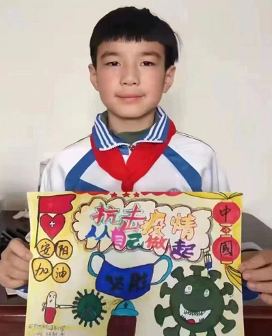 2021年安陽(yáng)疫情爆發(fā),全民抗疫。胡敬淵作為一名少先隊(duì)員,做不了醫(yī)生護(hù)士,也做不了志愿者,但他能做一名抗“疫”小戰(zhàn)士,只要呆在家里不外出,保護(hù)好自己,配合社區(qū)做核酸檢測(cè),就是在為抗“疫”做貢獻(xiàn)!隔離病毒,不能隔離愛(ài)。他制作了一幅幅設(shè)計(jì)新穎、圖文并茂,浸潤(rùn)了無(wú)限愛(ài)心的手抄報(bào),有的講述了如何做好自我保護(hù)抗擊疫情,有的表達(dá)了對(duì)沖鋒一線(xiàn)的白衣天使的深深敬意,有的則表達(dá)了對(duì)安陽(yáng)對(duì)湯陰的美好祝福……還有一些以錄制視頻的方式,為我們的城市加油、吶喊!他趁每次做核酸的機(jī)會(huì),積極主動(dòng)地向值班卡點(diǎn)的醫(yī)護(hù)人員和工作人員送去手套和熱水,送去溫暖和關(guān)心。