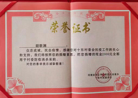 他還曾寄過(guò)愛(ài)心包裹,參與愛(ài)心募捐,把一片愛(ài)心傳遞到了更多需要關(guān)愛(ài)的人心中……累計(jì)為災(zāi)區(qū)、貧困兒童捐款捐物6000多元,受到社會(huì)的一致好評(píng)。印象最深的一次是2020年在老家過(guò)春節(jié),剛好趕上疫情,在胡敬淵的強(qiáng)烈要求下,爺爺陪他一起,用自己的壓歲錢(qián)向村委會(huì)捐贈(zèng)現(xiàn)金2000元。當(dāng)值班人員看到是孩子來(lái)捐款時(shí),執(zhí)意不接受,他說(shuō),國(guó)家有難,疫情嚴(yán)重,我們少先隊(duì)員也要表示我們的心意。隨后又多次購(gòu)買(mǎi)消毒液和酒精給醫(yī)護(hù)人員送去,并告訴叔叔阿姨一定要做好自我防護(hù)。