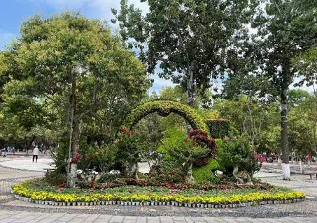 步入公園,10余個(gè)品種、5000余株紫薇在枝頭開得熱烈而奔放,紅的、白的、粉的、紫的......一簇簇,一叢叢,花團(tuán)錦簇,在夏日的微風(fēng)里搖曳生姿,讓人心醉。在公園西門入口處和中心廣場(chǎng),擺放的《年年有魚》、《云想花裳》兩組立體花壇奪人眼球,紫薇樁景錯(cuò)落有致地排列,紫薇樹干屈曲、枝葉繁茂、繁花朵朵,搭配各色時(shí)令花卉,組成公園優(yōu)美一隅;在紫薇大道,沿著游路擺放的80余盆花瓶造型紫薇和樹狀紫薇,造型優(yōu)雅、花朵嬌艷,花瓣隨風(fēng)搖曳,如詩如畫;最引入注目的紫薇盆景展區(qū),50余盆紫薇盆景及松柏類盆景,其造型或虬曲蒼勁、或蜿蜒盤旋、或古樸自然,耐人尋味。
