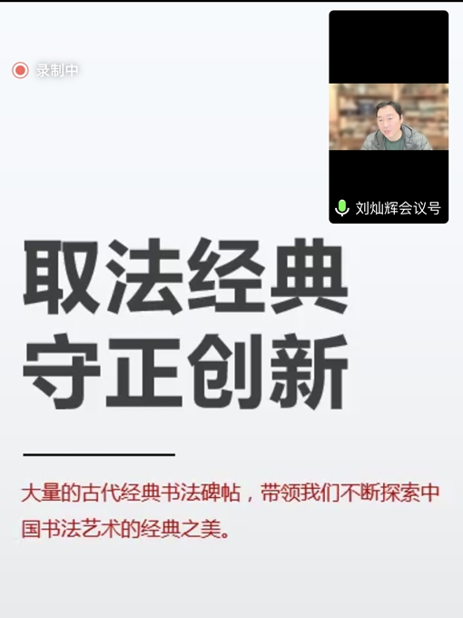 河南省書法家協(xié)會副主席、洛陽市書法家協(xié)會主席劉燦輝通過線上,向大家做了題為《書法選帖臨帖與創(chuàng)作入門》的專題報告,他通過引經(jīng)據(jù)典,深入淺出地告誡師生們要“取法經(jīng)典,守正創(chuàng)新”。