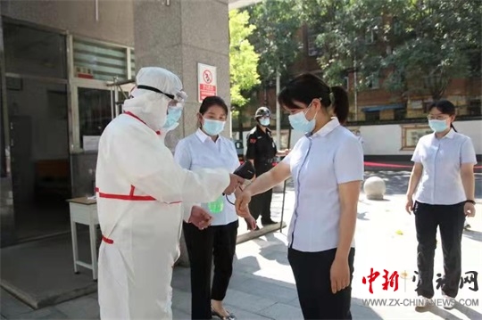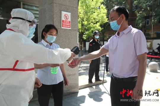 上午10點20分演練開始。教師們?nèi)膛宕骱每谡钟行蚺抨犎胄#昂箝g隔一米,依次通過學(xué)校紅外線自動測溫通道。檢測過程中發(fā)現(xiàn)一名發(fā)熱人員,立即啟動疫情防控應(yīng)急處置預(yù)案,并立即上報上級有關(guān)部門,在場校醫(yī)立即將學(xué)生引導(dǎo)至隔離地點,再次測量體溫,聯(lián)系附近醫(yī)院,轉(zhuǎn)運發(fā)熱人員,確保發(fā)熱人員不進(jìn)校,最后對校園環(huán)境做好消毒處置工作。